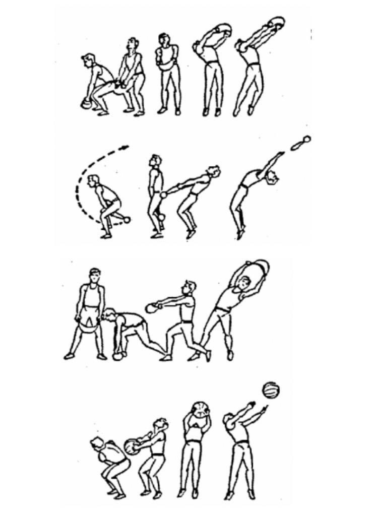 Lanzamientos de balón medicinal (arriba, abajo, lateral, rotaciones).