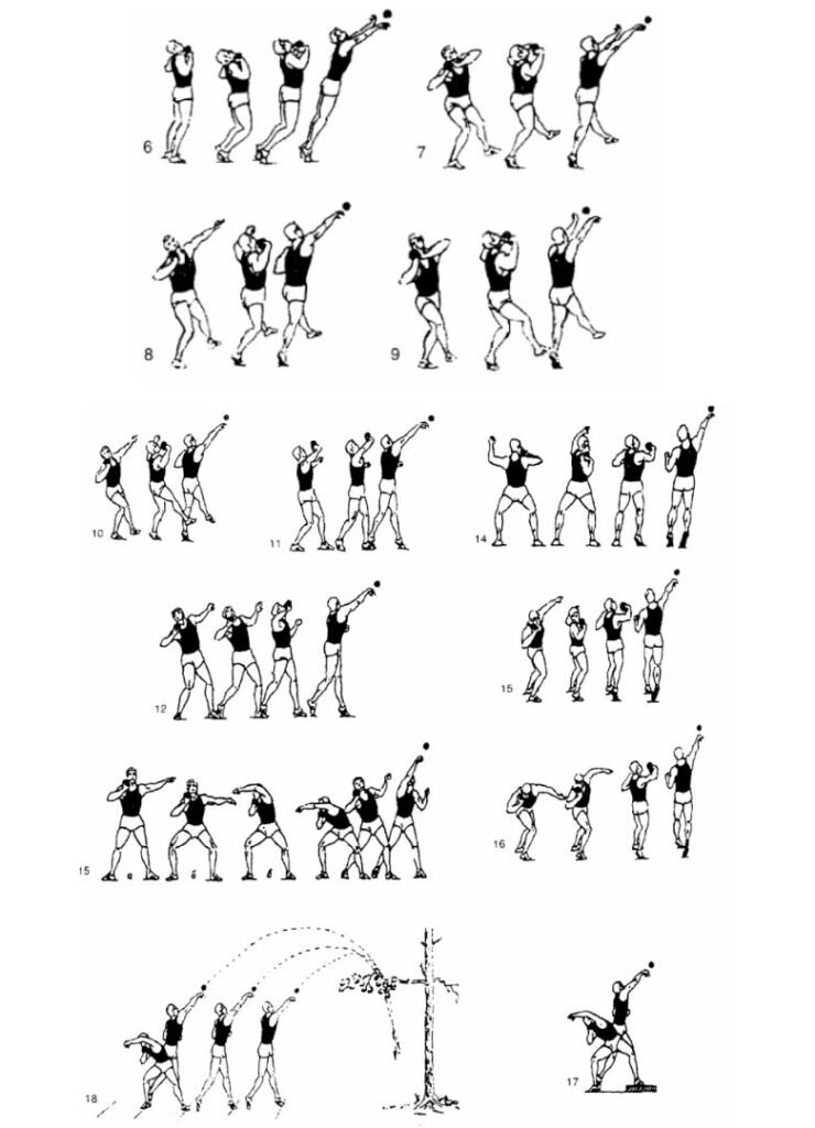 Variantes de multilanzamientos utilizados por lanzadores de bala (Stasjuk 1995) y por lanzadores de martillo obtenidas de Dunn 1194, Tschiene 1998.